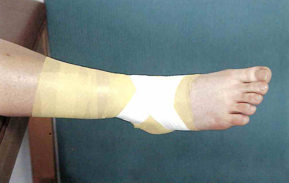 軽度の捻挫、軽度の肉離れなどの軽度外傷の受傷直後の応急処置として、 テーピングで固定することにより患部の動きを止め、また患部を圧迫することにより 腫れを軽減することができるため、ケガの悪化や痛みを和らげることができます。